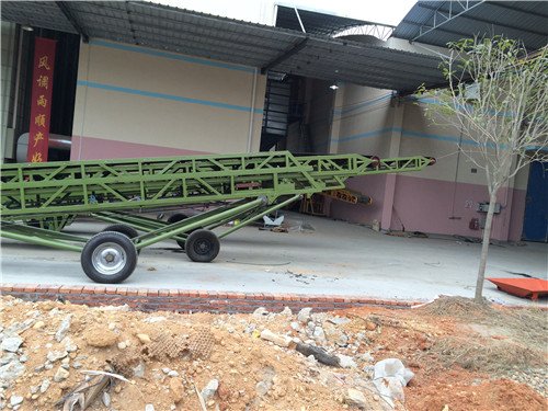 可伸缩带式输送机主要由两个端辊和紧套在辊上的封闭输送带组成。驱动传送带旋转的辊称为驱动辊(driving roller);另一个只改变传送带运动方向的滚筒叫做换向滚筒。驱动辊由电机通过减速器驱动,传送带被驱动辊和传送带之间的摩擦力拖动。驱动辊通常安装在卸料端,以增加牵引力并便于拖动。物料从进料端进料,落在旋转的传送带上,由传送带的摩擦力驱动,输送到出料端出料。